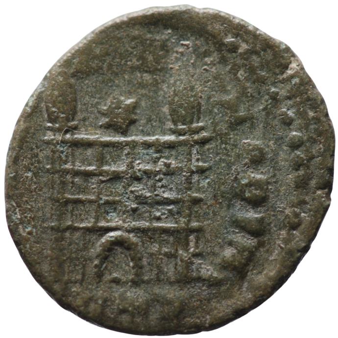LaZooRo: Rimsko cesarstvo - AE4 Magnusa Maximusa (383-388 n. št.), vrata kampa, R, zelo visoki stolpi
