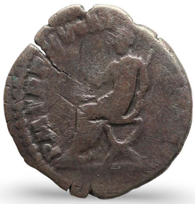 Sprednja stran: Komod, togat, sedi na kurulnem stolu, drži vejo in prečno žezlo.