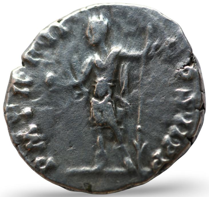 Rev: Cesar v vojaški obleki, stoji levo, drži globus in obrnjeno kopje.