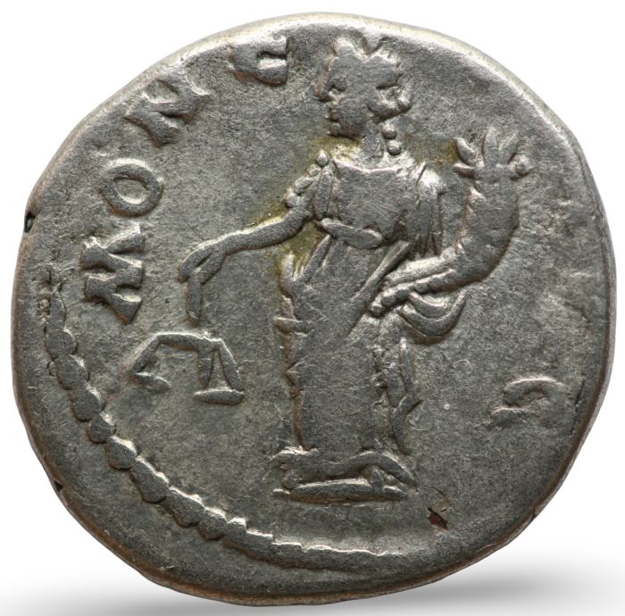 Rev: Moneta, pokrita, stoji levo, drži tehtnico v iztegnjeni desnici in rog izobilja v levi roki.