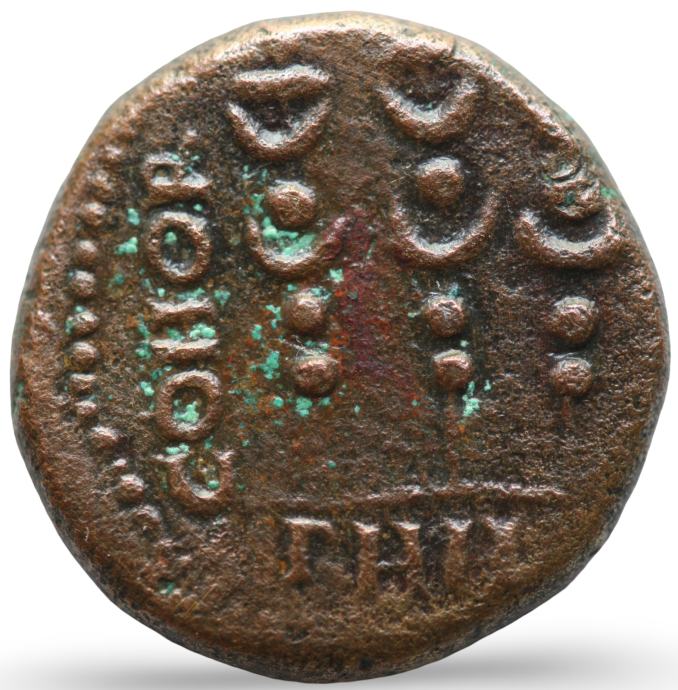 Bitka pri Filipih, ki se je leta 42 pr. n. št. odvijala med Brutom in njegovimi republikanskimi zavezniki proti Marku Antoniju in Oktavijanu, je bila odločilna zmaga za drugi triumvirat, vendar ni končala državljanskih vojn, ki so se nadaljevale še dvanajst let. Ta kovanec, ki zaradi materiala izdaje (baker se pred tem časom v Makedoniji ni uporabljal) izvira iz časa vladavine Klavdija ali Nerona, obeležuje bitko in naselitev veteranov pretorijanske kohorte v Filipih.