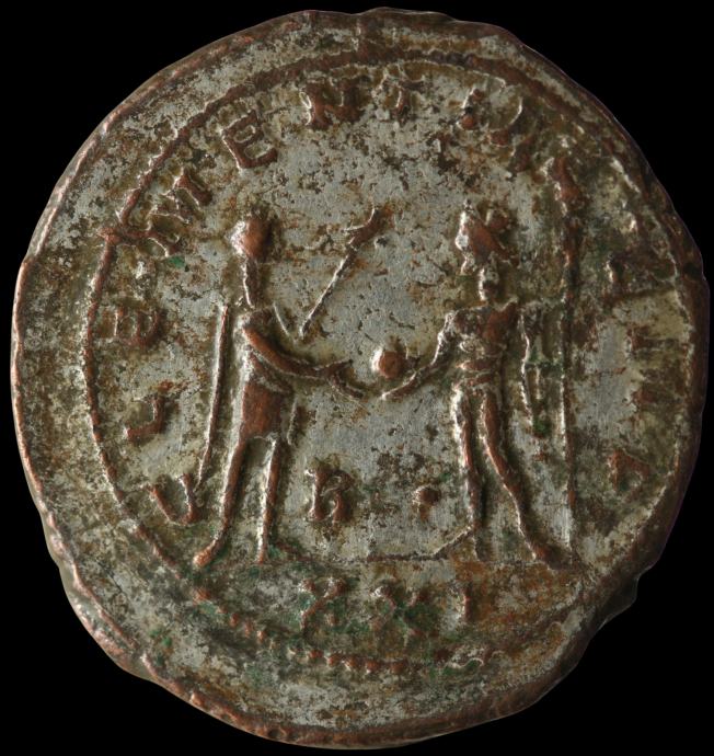Rev: Cesar stoji desno, drži žezlo z orlovo konico, prejema globus od Jupitra, ki stoji levo, drži žezlo; B pika v polju med, v exergue XXI.