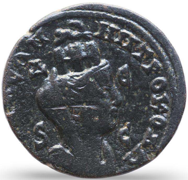 Spredaj: Doprsje z diademom in drapedom desno na polmesecu.