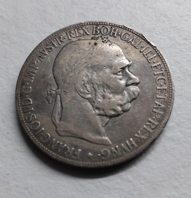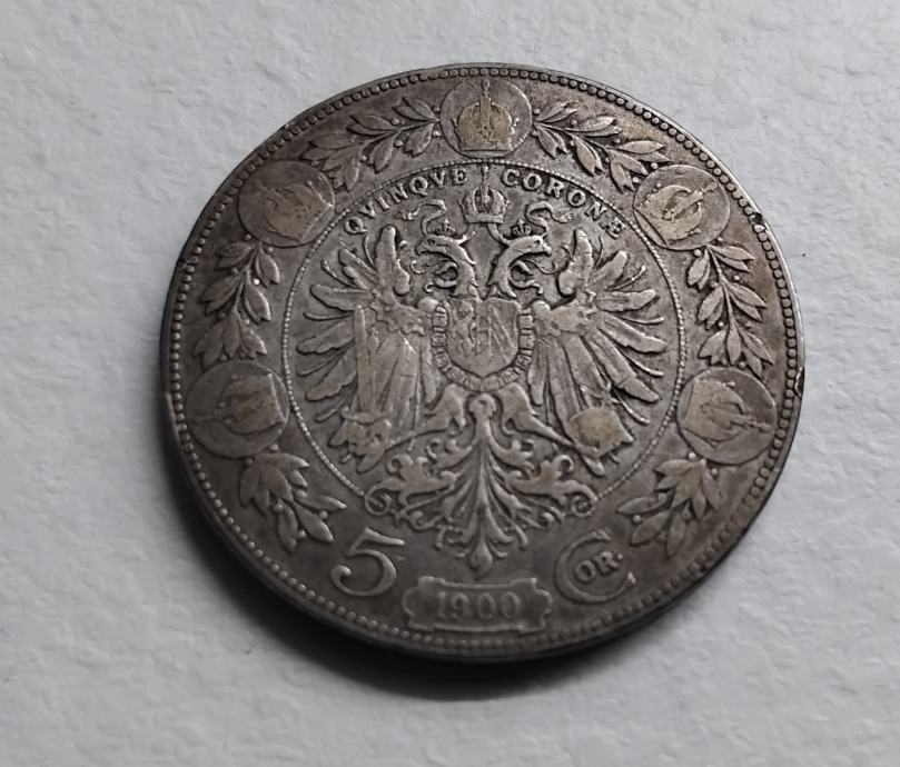 srebrnik AO 5 kron 1900- 1907, ohranjenost vidna na sliki, premer 36 mm, debelina 2,6 mm, 24 gramov.