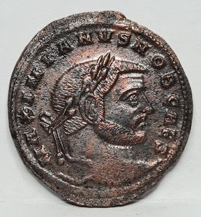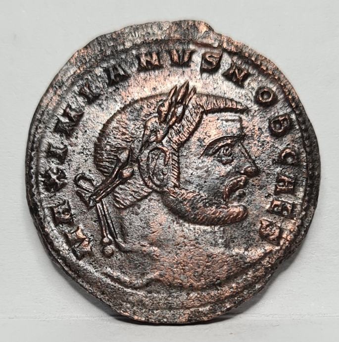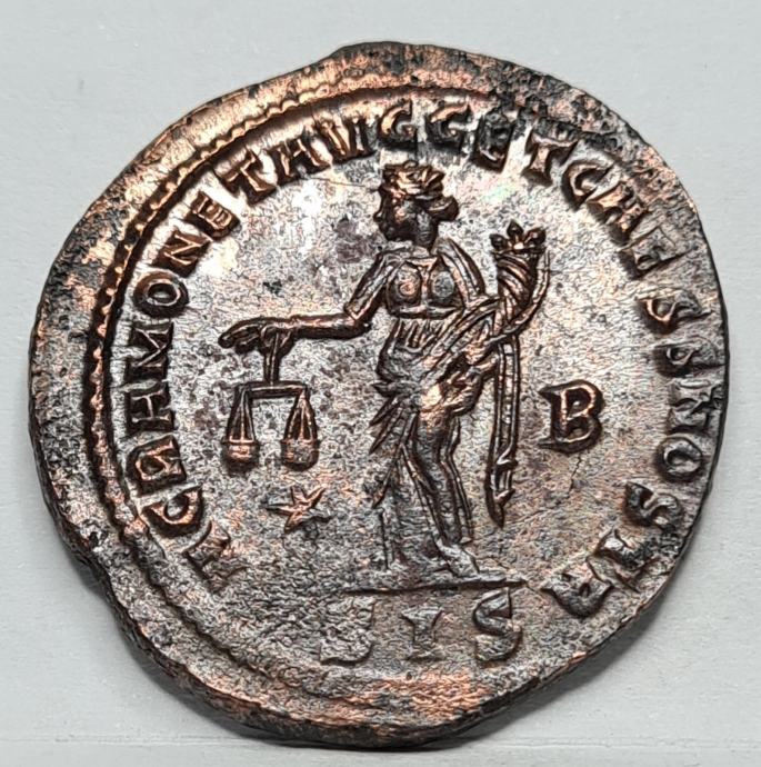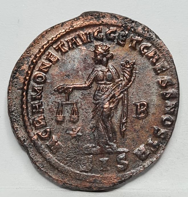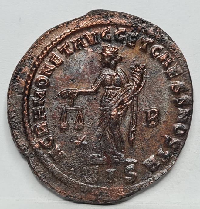 Velik rimski kovanec (AE Follis) v odlični kvaliteti, Galerius iz obdobja tetrarhije. Kovan v letu 300, SACRA MONETA rever. Očiščen, a se bo lepo patiniral v nekaj letih.