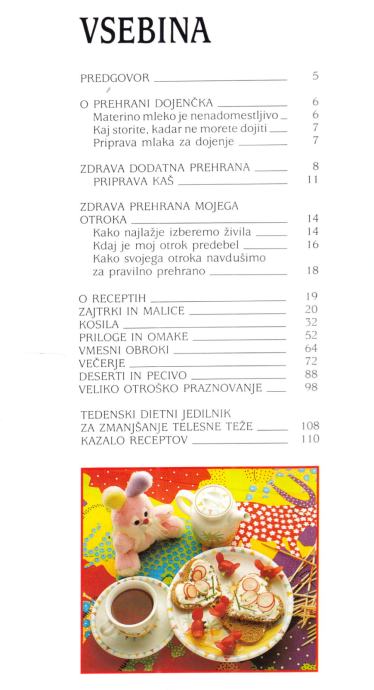 V prvem delu knjige boste izvedeli vse, kar morate vedeti o dojenju, o doma pripravljenem mleku za zalivančke in o hrani, ki jo dodajamo ob dojenju, ko dojenček ni več odvisen le od materinega mleka. Drugi del sestavljajo številni recepti, ki se lahko kosajo z vsakim hamburgerjem, čipsom ali hrenovkami in so odlične zamenjave za prepogosta mašila v prehrani. V knjigi boste za to našli recepte s preprostimi navodili in izračunanimi hranilnimi vrednostmi, prav tako pa ne manjkajo tudi številni predlogi za malice, sladke prigrizke, pecivo in domiselne rešitve ob otroškem rojstnem dnevu.