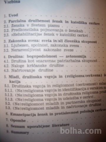 1. uvod 2.parcialna družbenost žensk in katoliška cerkev 3.zakonska zveza: sveta in ali človeška skupnost 4.družina: bogopodobnost-avtonomija 5. mladi,družinska vzgoja in (religiozna/cerkvena) identifikacija 6. emancipacija žensk in protislovnost položaja cerkve...