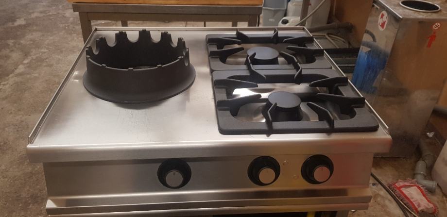 Plinski štedilnik dva gorilnika 4,5kW in 6kW in gorilnik za kuhanje z wokom 18kW, razstavni sejemski izdelek, dim: 800x700x900mm, prodamo!