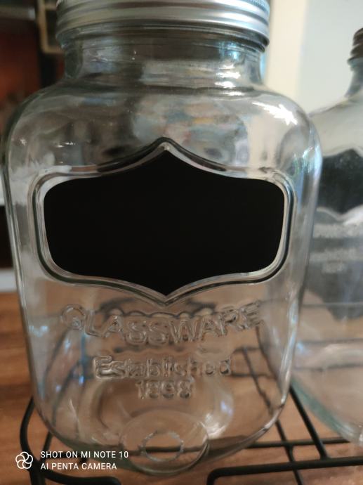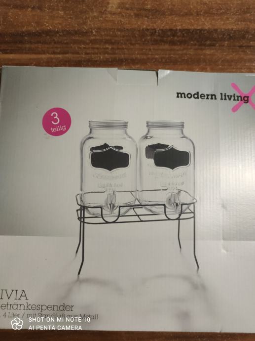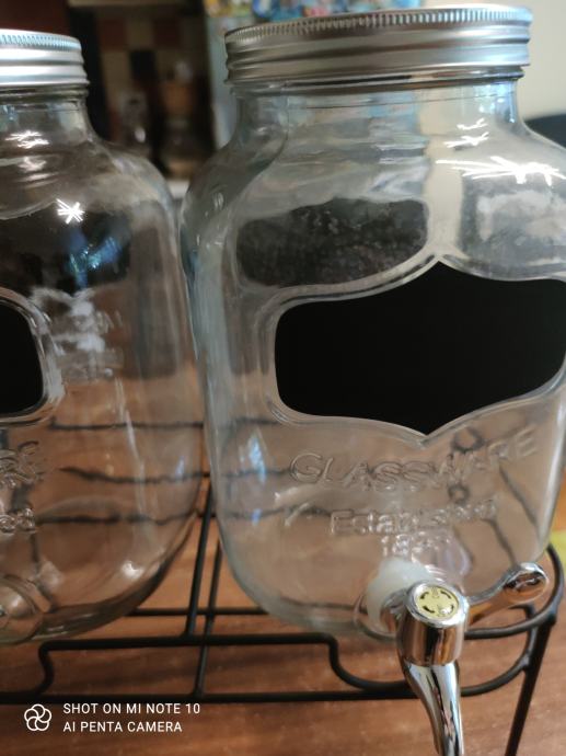 Dve stekleni posodi za točenje limonade na kovinskem podstavku in točilna pipa.Ena posoda zal nima točilne pipe ker se je zgubila..V posodo gre cca 4l vode.