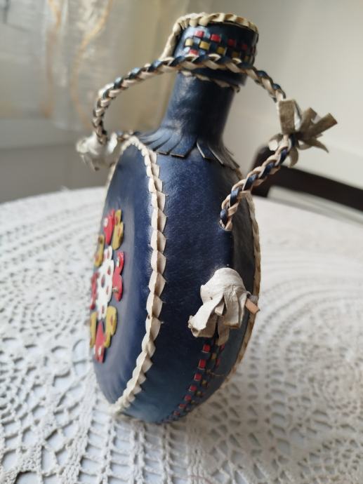 Suvenir - steklenici v usnju z lepo izdelavo, premer 16 cm, širina 5 cm, višina 22 cm,
