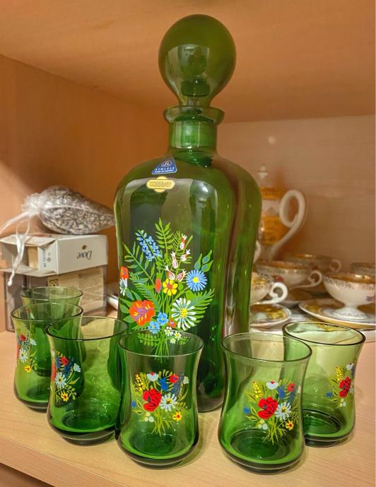 Čudovita steklenica, zelena s prekrasno poslikavo in 6 kozarčkov, za žgane pijače.