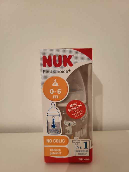Prodam nikoli rabljeno NUK first choice flaško, 0-6m, anti-colic cucelj.