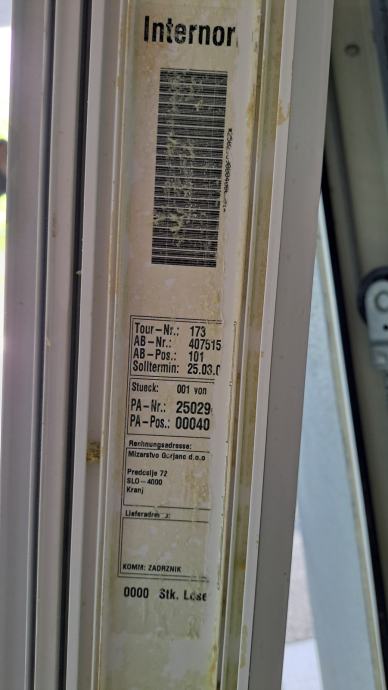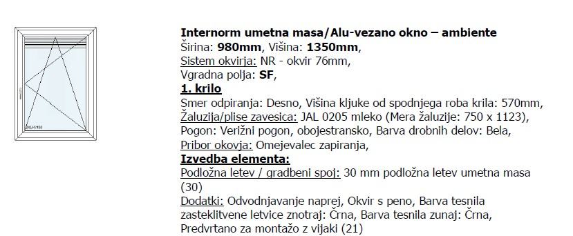 Prodam zelo kvalitetno enokrilno okno INTERNORM. Aluminij, velikost: 980x1350 mm. Okno je bilo vgrajeno z vijaki in purpen peno nekaj let. Je troslojno - pomeni, da se med dvema stekloma (ta komora je napolnjena z izolativnim plinom) nahajajo žaluzije in prek tega gre še eno stekleno krilo. Zaradi tega je okno visoko izolativno. Specifikacije najdete na priloženih slikah. Na oknu je le ena, mala poškodba, na spodnjem zunanjem okvirju (na eni od slik sem jo označil v rdečem kvadratku). Gre za vdrtino, barva je nepoškodovana. Vdrtina je nastala ob neuspelem poskusu vloma!