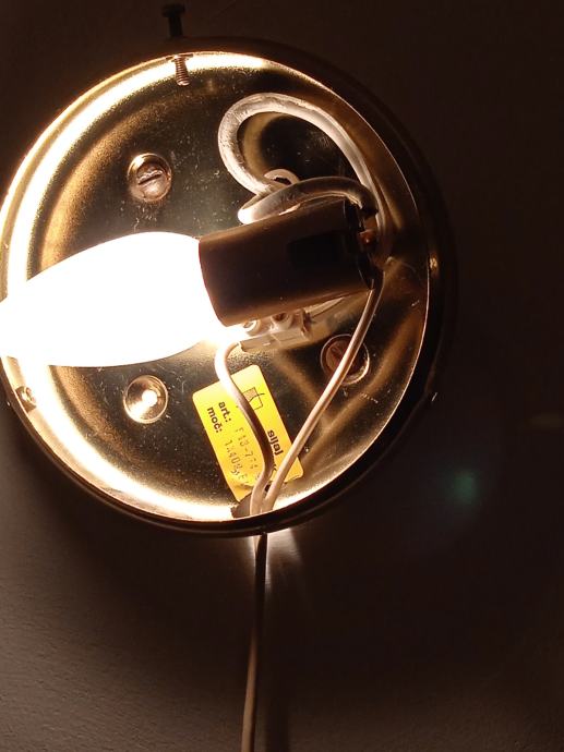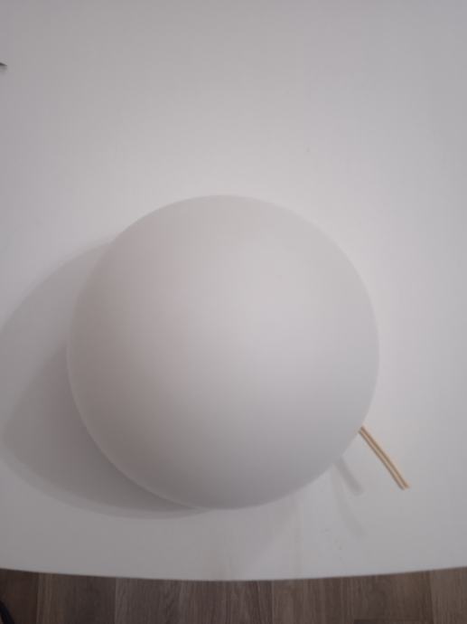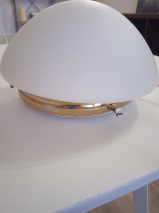 Izdelana v steklarni Hrastnik. Material medenina, bučka iz mlečnega stekla. Lepo ohranjena, nepoškodovana. Premer 17 cm.