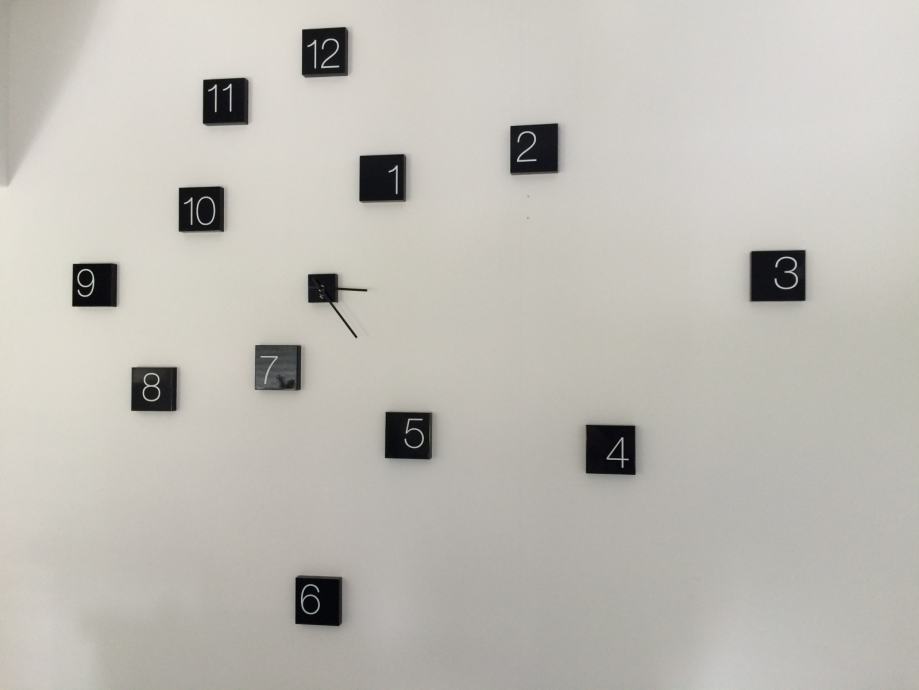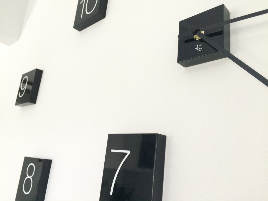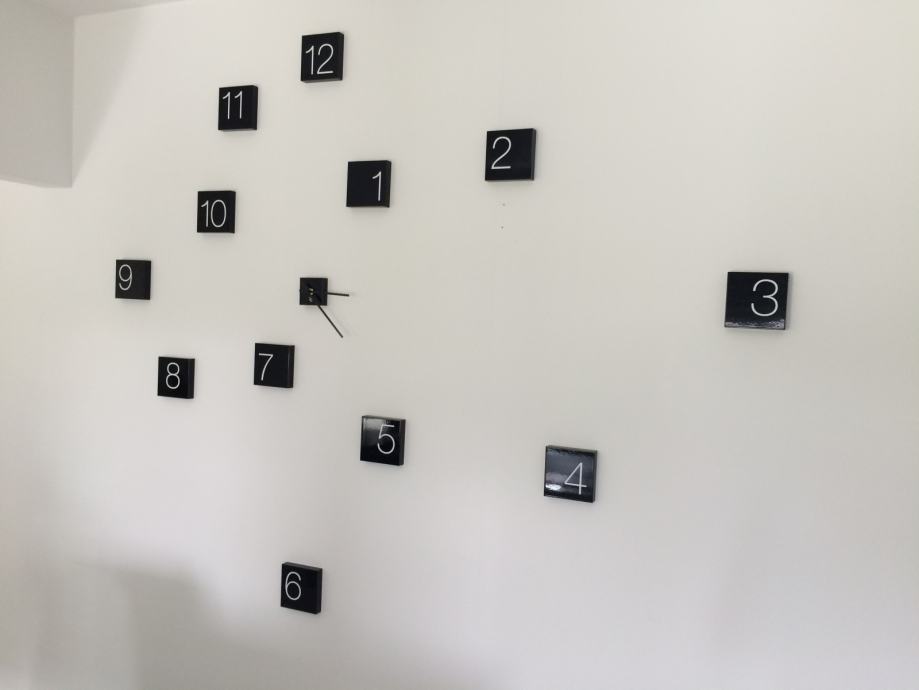 ročno narejena stenska ura iz 13 kvadratov, pobarvanih v črn visok sijaj. Postavitev kvadratov je poljubna. Velikost enega kvadratka je 10x10 cm. Montaža je enostavna, vsak kvadratek je na svojem žeblju tako, da se ga enostavno lahko odstrani, če se pleska zidove.