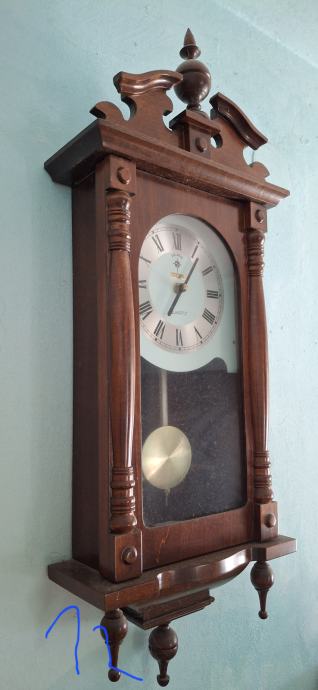 Prodam stensko uro na nihalo znamke Quartz; deluje na baterije, se ne oglaša ob polni uri. Okvirne dimenzije (vxšxg) : 77 x 30x 12 cm.
