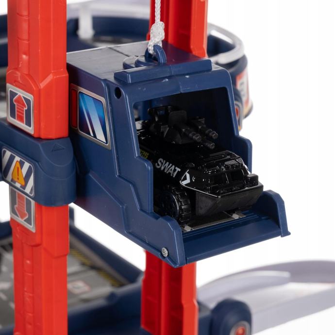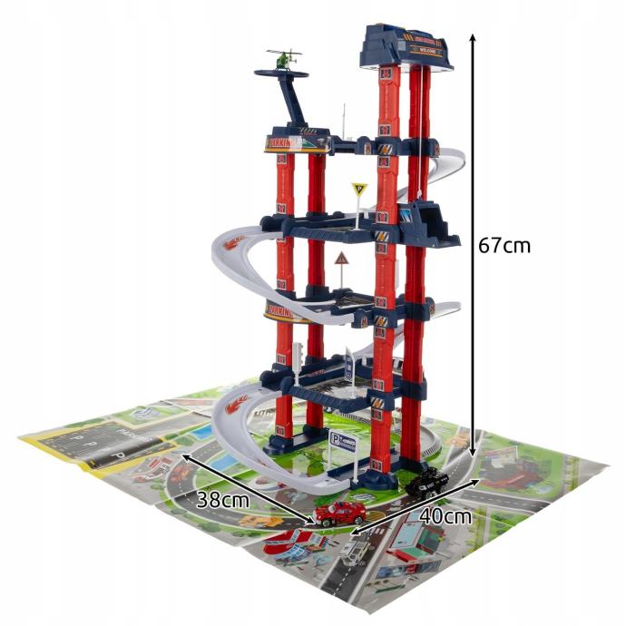 - FUNKCIONALEN IN MODEREN DIZAJN – na vrhu garaže je pristajališče za helikopter, ki igri doda realističnost in popestri igralne scenarije. Vsak nivo garaže je zavarovan z ovirami , ki ščitijo avtomobile pred izpadom, ustrezno postavljeni prometni znaki pa vam omogočajo, da sami oblikujete prometna pravila. Popolnoma oblikovana proga z ovirami, ki vodi od samega vrha, omogoča nemoten spust avtomobilov , kar zagotavlja razburljivo vožnjo. Poleg tega dvignjen kanal na najvišjo raven je odličen dodatek, ki omogoča kreativne rešitve in dodatne možnosti zabave.