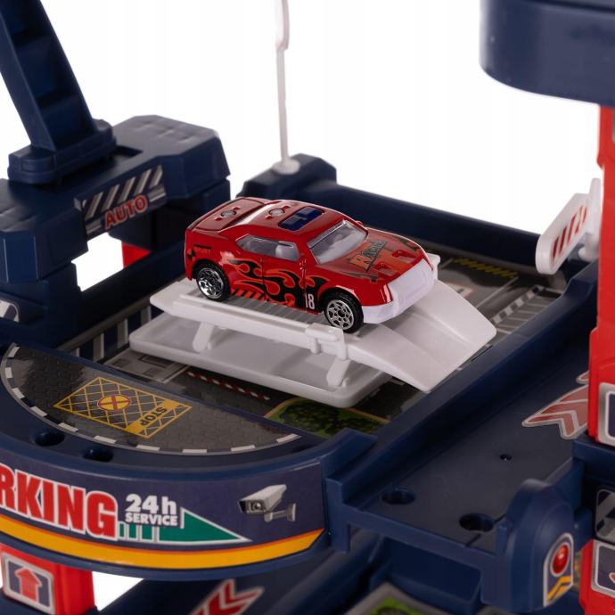 Komplet vključuje parkirno garažo s podrobnimi dodatki, kot so rampe, oznake in oznake za parkiranje, ki ustvarjajo pravo mestno parkirno okolje. Parkirna garaža je združljiva s številnimi vrstami igračkarskih avtomobilčkov standardne velikosti. Dvigalo se premika z gumbom na baterijski pogon, kar otrokom omogoča enostavno dvigovanje avtomobilov na višje etaže. Ta garaža je primerna za otroke od 3. leta starosti naprej, saj podpira njihove motorične sposobnosti in spodbuja igro vlog.