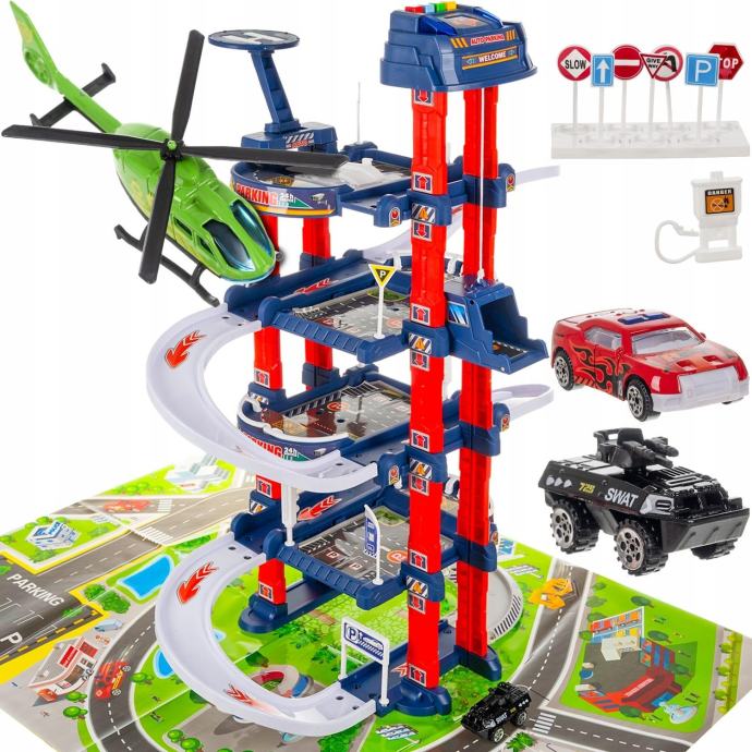 - DODATKI, KI POPEŠAJO VAŠO ZABAVO – v kompletu je tabla iz kvalitetnega ABS-a s prikazom mestne infrastrukture , na kateri postavite garažo in postavite prometne znake. Tabla dodaja realističnost in širi možnosti igranja, kar vam omogoča, da zgradite lastne poti in scenarije. Komplet vsebuje dva avtomobila – dirkalnik in bojno vozilo – ter helikopter, ki sta izdelana iz vzdržljivih PS in ABS materialov. Komplet prometnih znakov omogoča ustvarjanje personalizirane in varne prometne infrastrukture. Vsak parkirni nivo lahko dodatno nalepite priložene nalepke za nastavitev prometnih znakov in oznak, kar pomeni, da lahko otroci popolnoma prilagodijo videz garaže svojim potrebam in željam.