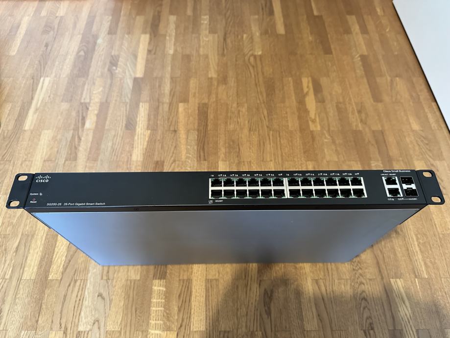 Rabljeno ampak lepo ohranjeno 1Gbit, 26-portno stikalo Cisco SG200. Stikalo ima 24x 1Gbit port in 2x kombinirani port 1Gbit copper ali 1Gbit sfp. Stikalo je brez ventilatorjev in med delovanjem neslišno, torej ga lahko uporabimo tudi v pisarni ali v bivalnih prostorih. Primerno za vgradnjo v domače omrežje ali omrežje manjšega podjetja.