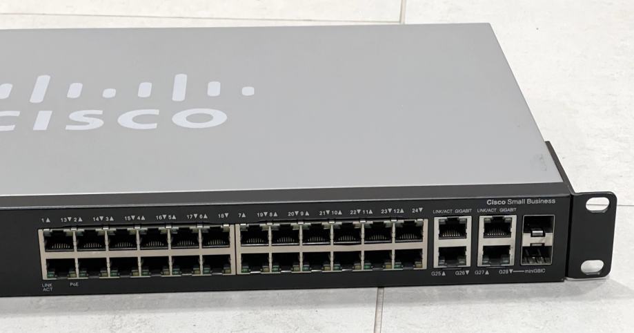 Prodam Cisco SG300-28p PoE mrežni router/stikalo. Brezhibno delujoče. V kompletu z "rack mount" za montažo v 19" mrežno omaro in napajalnim kablom.