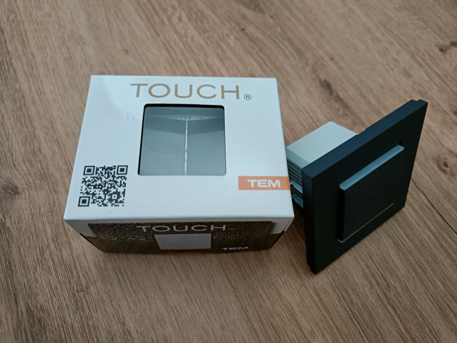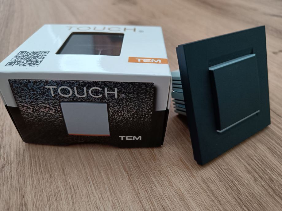 Zatemnilno stikalo TOUCH (TEM Čatež, http://www.touch.si/resitev.html) s ploščo za montažo in okvirjem Modul LINE (TEM Čatež) v črni mat barvi.
