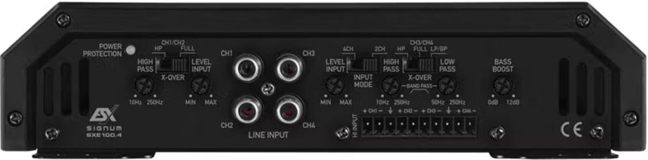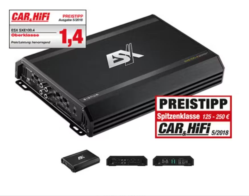 ESX SXE100.4 odlikujejo neverjetne tehnične karakteristike za sprejemljivo ceno. Ojačevalec zmore 4 x 65 W 4Ω, 4 x 100 W 2Ω RMS moči. Ojačevalnike so nadgradili s High-input vhodi s samodejnim vklopom. Opremljeni so s sistemom za zaščito pred napakami (EPS), ki preprečuje nezaželene napake pri priklopu ojačevalca na OEM enoto. Za kontrolo nad močjo skrbi široka paleta nastavitev, ki zagotavlja izredno kvalitetno reprodukcijo glasbe. Tukaj sta nepogrešljiva nizko- in visokoprepustni filter ter BassBoost. Poleg RCA vhoda ima tudi RCA izhod za enostavno priključitev dodatnih ojačevalcev.