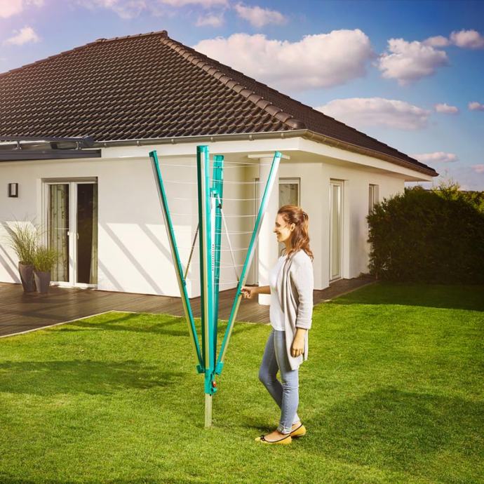 Leifheit Vrtni sušilec perila Linomatic 500 Plus je primeren za 50 metrov sušilne površine, za 5 pralnih strojev perila. Enostavna uporaba sušilca, preprosto odpiranje in zapiranje sušilca z uporabo ročaja na podporni roki omogoča odpiranje in zapiranje sušilca z minimalnim naporom in brez sklanjanja. Primeren je tudi za posebej velike kose perila, kot so posteljnina, odeje, zavese. Najdaljša dolžina vrvi je 2,03 metra, diagonala sušilca pa 3,28 metra. Teža znaša 6,3 kg. Osem kavljev za obešalnike omogoča praktično sušenje srajc, bluz. Po višini je nastavljiv v 10 stopnjah, tako da si vsak lahko nastavi idealno delovno višino od 1,06 m do 1,72 m. Ko sušilec zapremo se vrvice potegnejo navznoter - samodejni umik vrvic, tam so varne pred vlago in umazanijo in tako je perilo vedno čisto. Tehnologija napenjanja zagotavlja napete vrvice v vsakem trenutku. Vključen je talni vložek za vgradnjo v beton. Izdelano v Nemčiji.