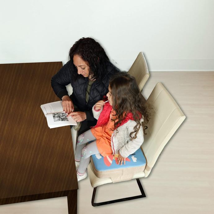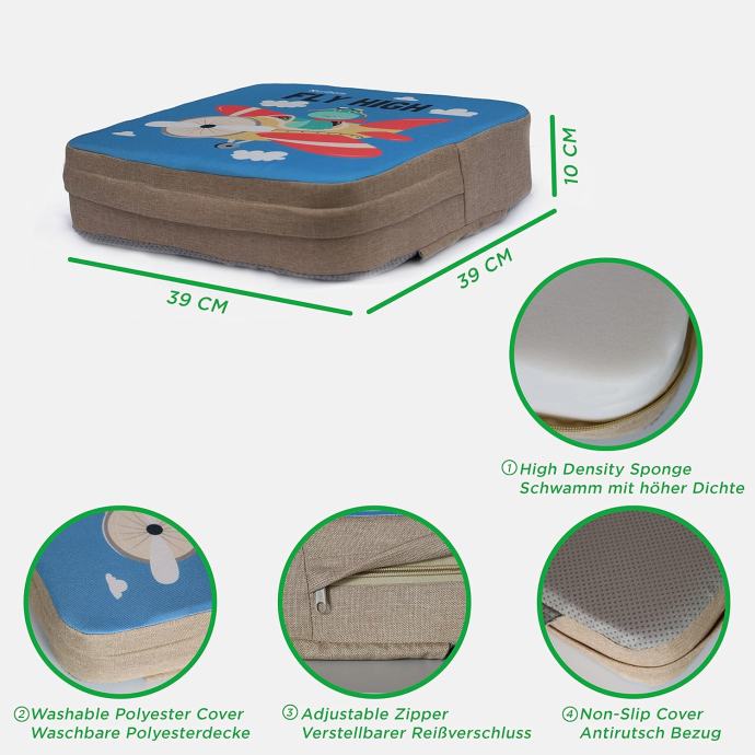 Prodam blazino, ki se pritrdi na stol, in tako otroku omogoča sedenje pri mizi. Tako stol postane dovolj visok, da otrok lahko skupaj z vso družino sedi pri kosilu, riše, ustvarja, se igra ... Mere: 39 x 39 x 10 cm. Blazina ima dve prevleki, ki sta snemljivi in normalno pralni v pralnem stroju pri 40 stopinj Celzija. Podrobnosti (namestitev ...) so razvidne iz priloženih slik (moja prevleka ima namesto motiva aviona motiv dinozavra - glej zadnjo sliko). Vse je lepo ohranjeno. Blazina je znamke Nuribom in je bila naročena preko Amazona (original cena 33,26 €).