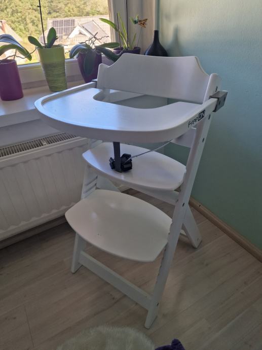 Prodam rabljen lesen stolček za hranjenje. Stolček je bele barve in ima pladenj.
