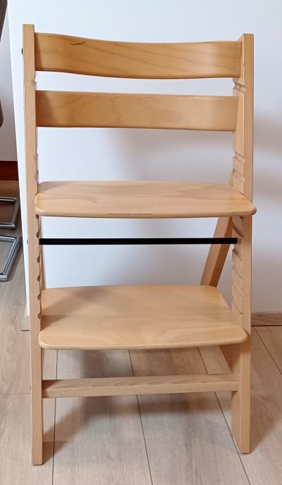 Prodaja se otroški stol – naravne barve, iz bukve, nastavljiv z varovalom za otroka, ki daje dodatno varnost in stabilnost med hranjenem.