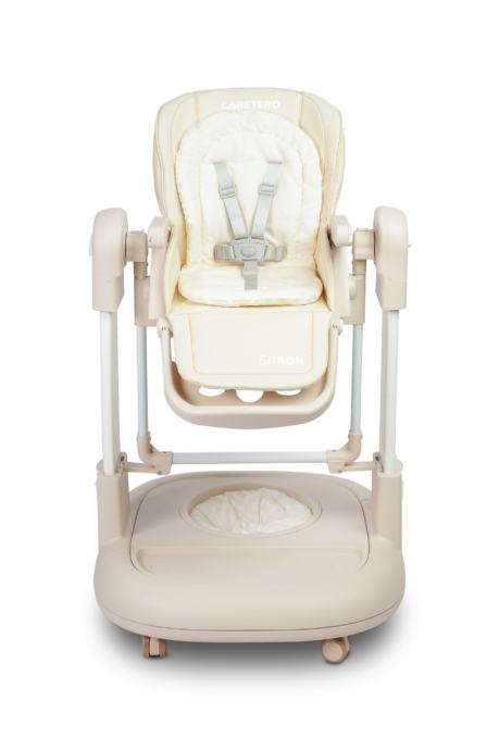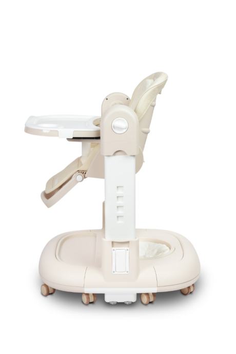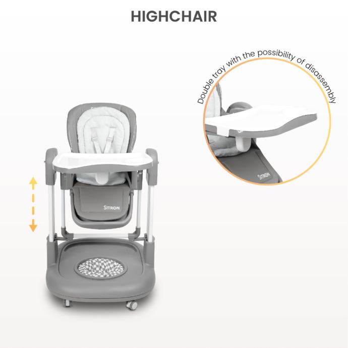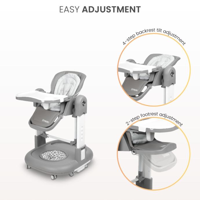 Opremljen je z dvojno odstranljivo pladnjo, ki omogoča enostavno čiščenje. Višina sedenja je nastavljiva v 5 stopnjah, naslonjalo v 4 položajih, pladenj pa se lahko prilagodi oddaljenosti od otroka. Dodatna mehka podloga zagotavlja udobno sedenje.