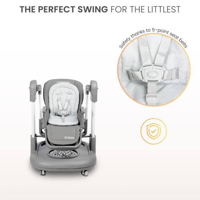 Nežno guganje poskrbi za sprostitev, krajši počitek ali igro. Stabilna zasnova in varnostni pasovi skrbijo, da je otrok varno nameščen.
