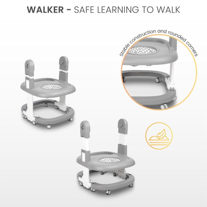 Pomaga otroku pri varnem učenju hoje. Trdna konstrukcija, zaobljeni robovi in nastavljiva višina zagotavljajo varno in udobno gibanje. Vgrajen pladenj omogoča igro ali postrežbo manjših prigrizkov.