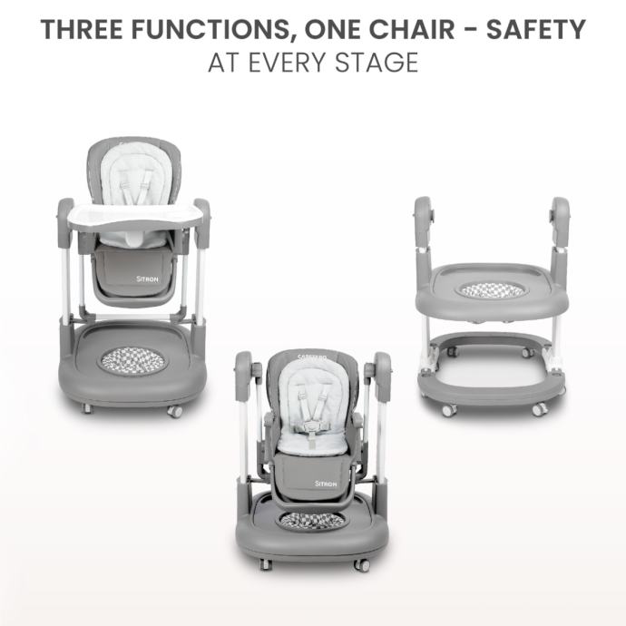 Sitron 3v1 je praktična rešitev za starše, ki želijo en izdelek z več funkcijami. Deluje kot stolček za hranjenje, gugalnik in hojica, zato bo spremljalo otroka od prvih mesecev pa vse do trenutka, ko začne samostojno raziskovati svet. Namenjeno je otrokom od 6 do 36 mesecev in največje dovoljene teže 15 kg.