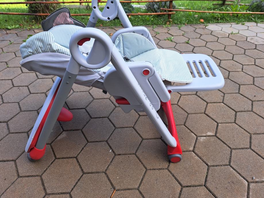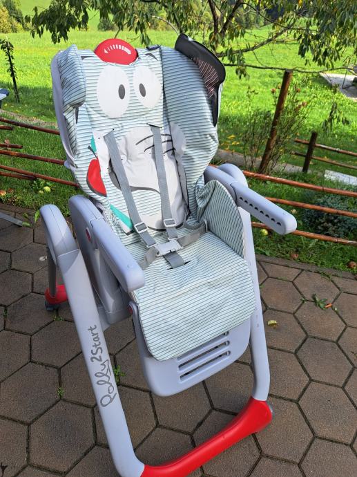 Je malo rabljen, saj naša ni želela sedeti v njemu. Nastavljiv na 8 višin in se tako prilagodi tudi višini jedilne mize. Naslon nastavljiv v več položajev, tako da je primeren tudi kot ležalnik za novorojenčka (pri nas služil večinoma, ko je še ležala). Ušesa slona se nastavijo z vrtljivim ročajem na vrhu, tako da ima stransko zaščito v ležečem položaju. Mizica ima tudi odstranljiv pladenj, ki ga enostavno snameš in hrano splahneš z njega. Blazina čista, nepoškodovana. Stolček je očiščen in pripravljen za novega nadobudneža.