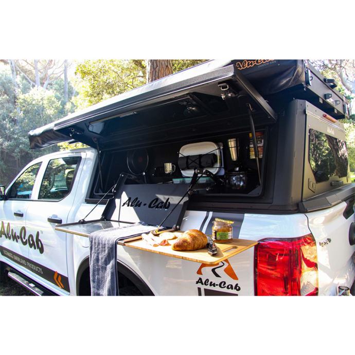 Kit vsebuje vse potrebno za kuhanje na poti, vključno s posodo, priborom, stojalom za začimbe in vgrajeno rezalno desko.