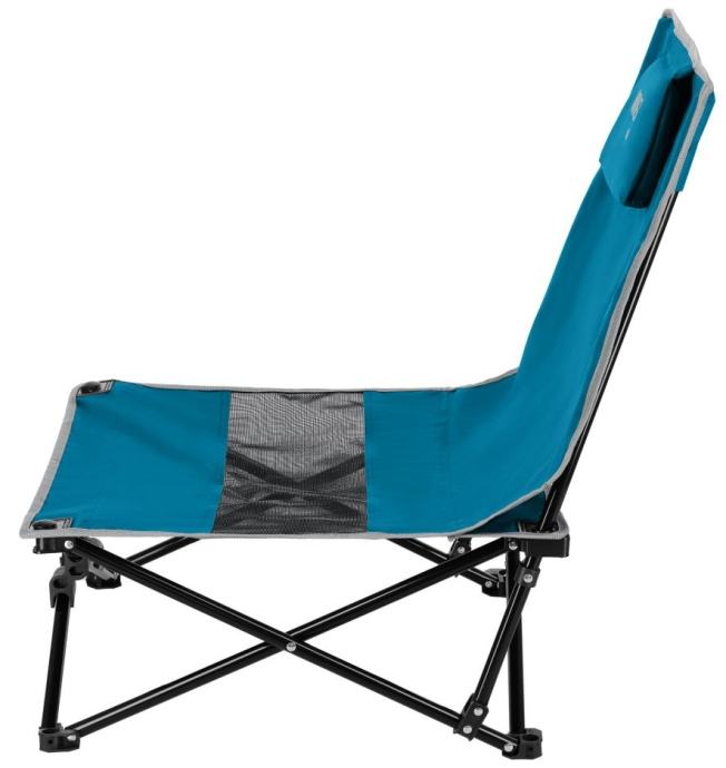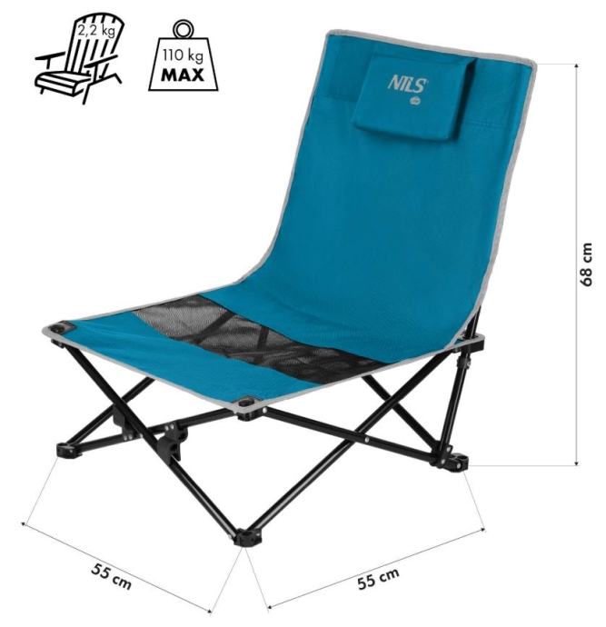 Nizek udobni stol za plažo, kamp, piknik, jezera, izlete, festivale. Ogrodje stola je izdelano iz trpežnih jeklenih cevi s premerom 13 mm. Celoten okvir je prekrit s črnim prašnim premazom, ki ščiti pred korozijo. Sedež in naslonjalo sta izdelana iz trpežnega poliestra 600D, ki je dodatno prevlečen s plastjo PVC-ja. Ta material ni le odporen na odrgnine in vlago, ampak je tudi zelo enostaven za čiščenje. Tehta le 2,2 kg, zaradi česar je izjemno priročen in enostaven za prenašanje.