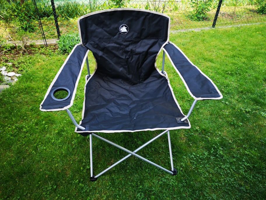 Zložljiv stol, ki nudi veliko udobja zaradi naslonjala sedeža in sedežne prevleke brez prečk. Stol je zaradi robustne kovinske konstrukcije zelo stabilen. Naslonjala za roke imajo nosilec za kozarec.