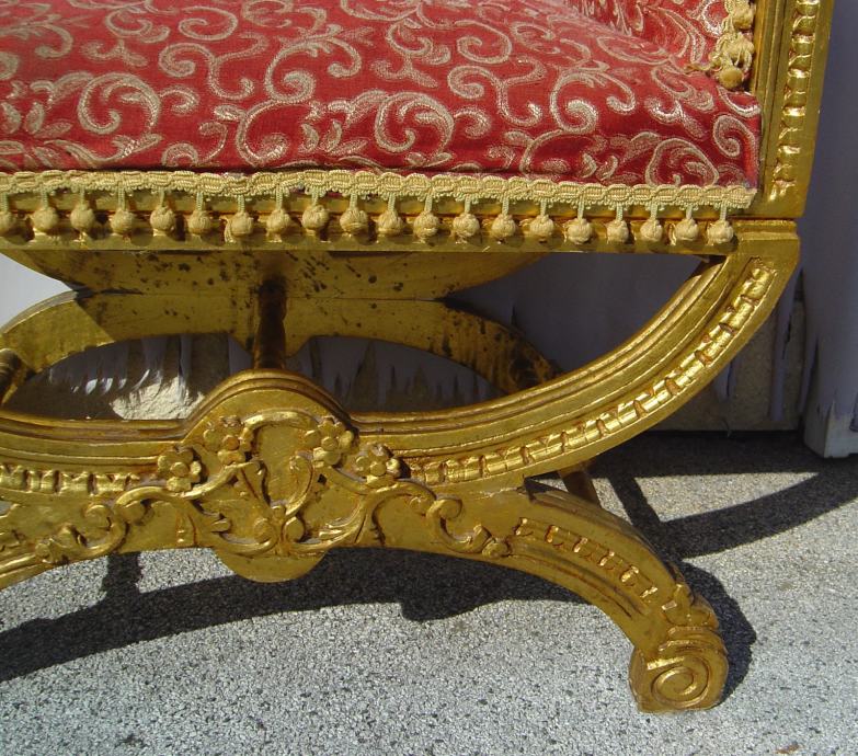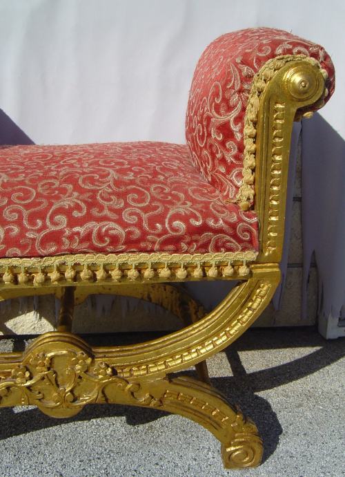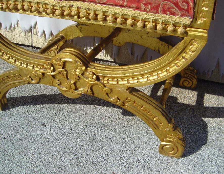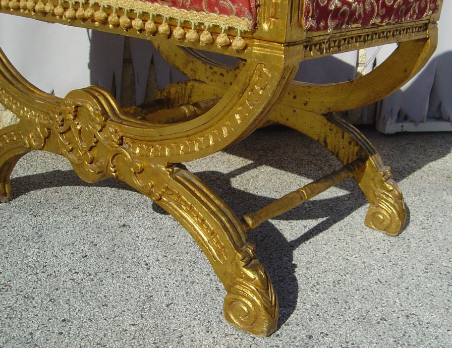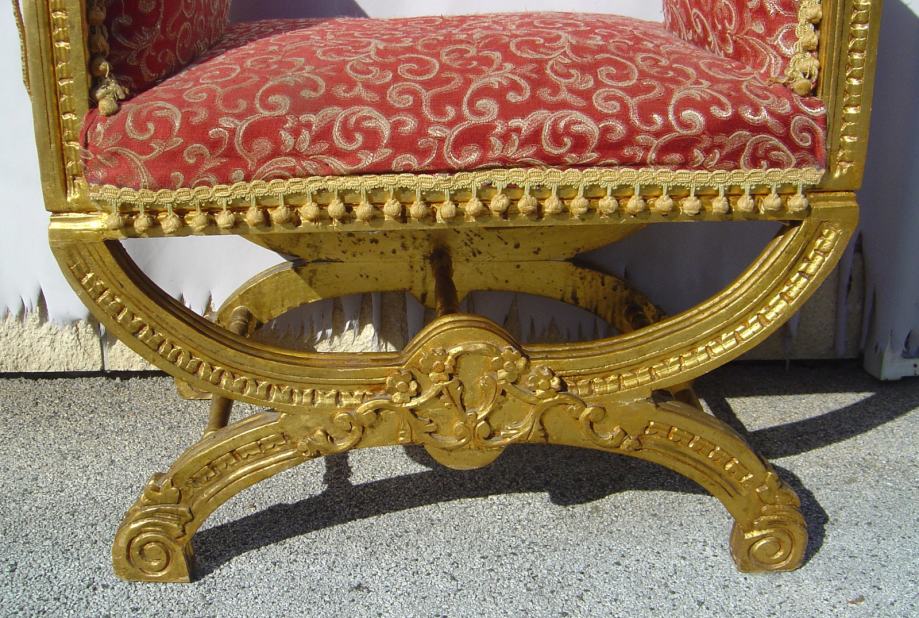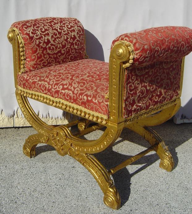 ZELO REDEK ORIGINAL OKOLI 220let STAR EMPIRSKI STOL VEČJIH DIMENZIJ. V CELOTI ROČNO REZLAN. S POZLATO. POSEBNA OBLIKA STOLA, KI IZVIRA ŠE IZ ČASOV STAREGA EGIPTA. V PRETEKLOSTI SO TAKŠNE STOLE OBIČAJNO IMELI V SPALNICI. LESENI DEL TRDEN MASIVEN IN V ODLIČNEM STANJU ZA TAKOJŠNJO UPORABO. BLAGO JE POTREBNO ZAMENJATI.