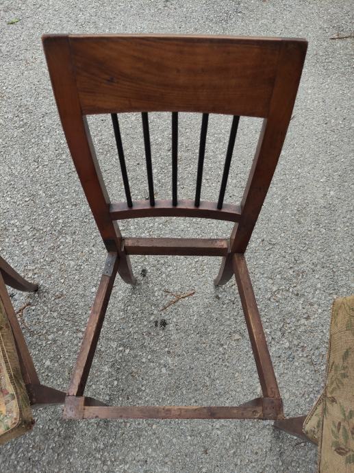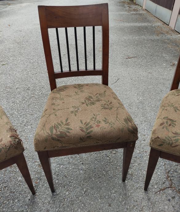 Prodajajo se štirje oblazinjeni stoli iz obdobja Bidermajer. Stoli desetletja niso bili v uporabi. Izvirajo iz družinske meščanske hiše na Ravnah na Koroškem - Guštanju. Tapecirana podloga je verjetno original bi jo bilo treba prenoviti. Pri enem naslonu manjkata dve navpični črni palici, sicer pa so stoli zelo lepo ohranjeni.