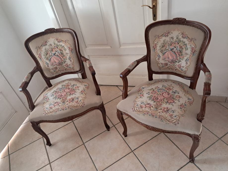 Prodajam dva dobro ohranjena naslanjača v baročnem stilu. Izdelana iz masivnega lesa z dekorativnimi rezbarijami. Tapecirana s klasičnim romantičnim in cvetličnim motivom. Stola sta primerna za takojšno uporabo.