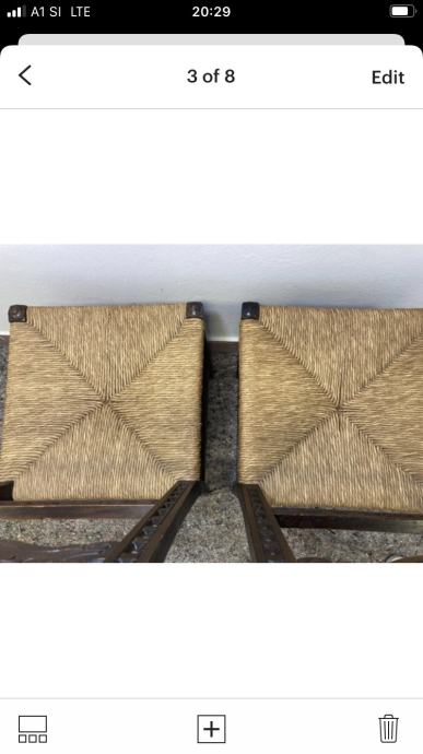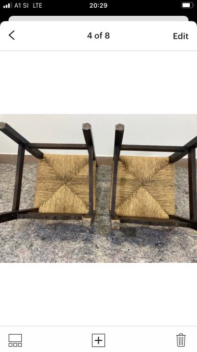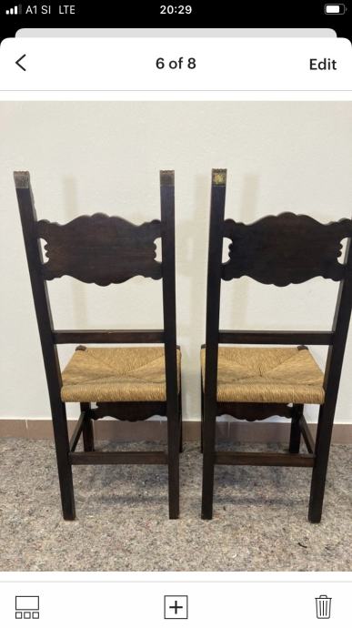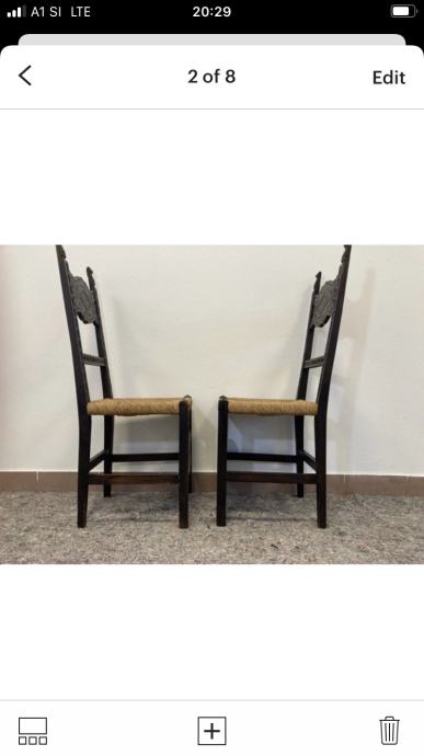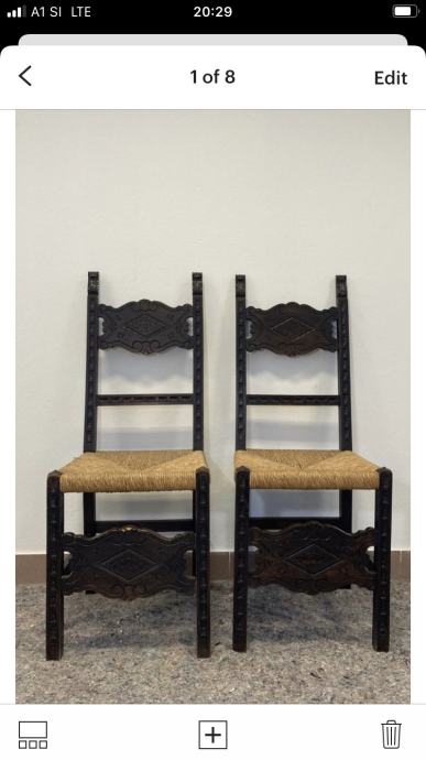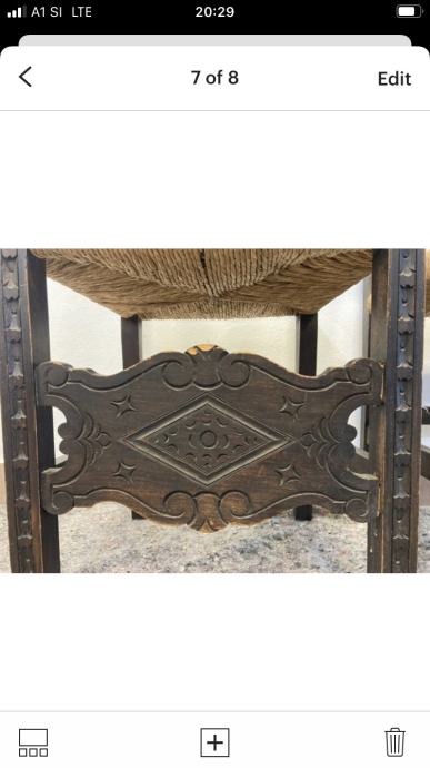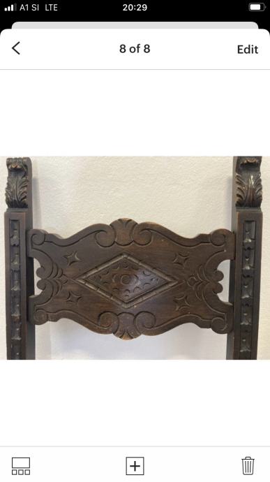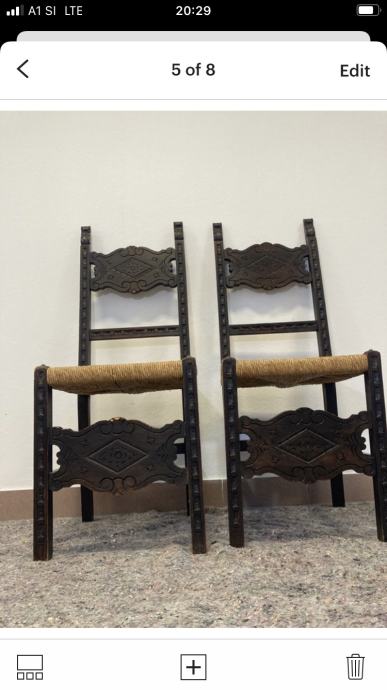 Na voljo dva zelo ekstravagantna stola iz 18. Stoletja , izvor Italija, temen les je ročno obdelan in razvarjen v cvetličnem vzorcu! Redka najdba, cena je za par! Višina 110cm, višina sedala 47