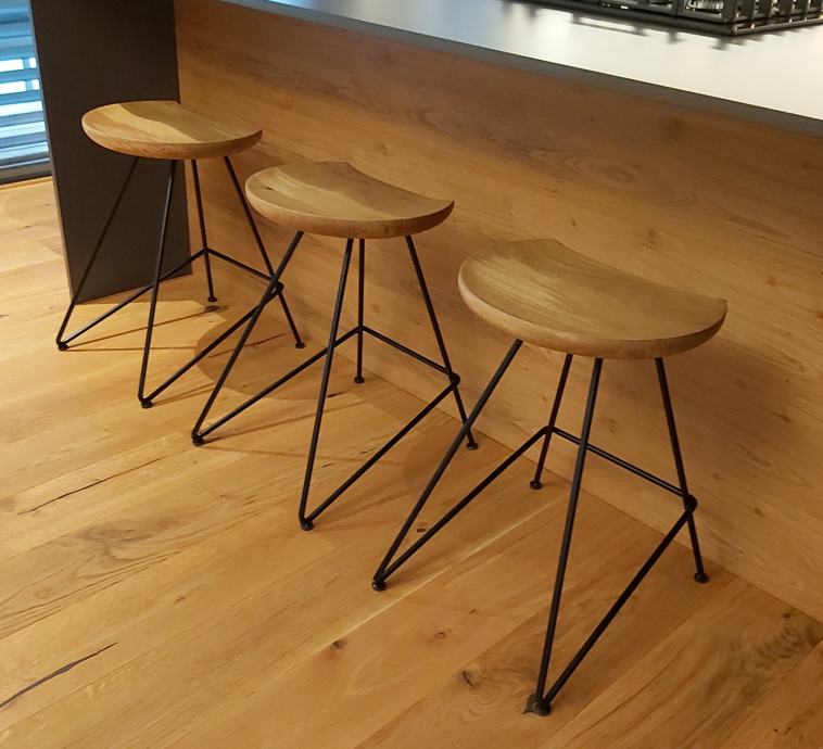 Prodamo barske stole Izdelani v Sloveniji. Barva podnožja črna, sedalni del masivni hrast. Primerno za kuhinjske pulte od višine 90 cm dalje. Širina 42, globina 49 cm.