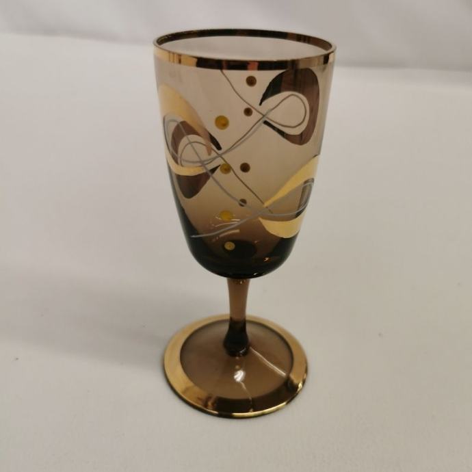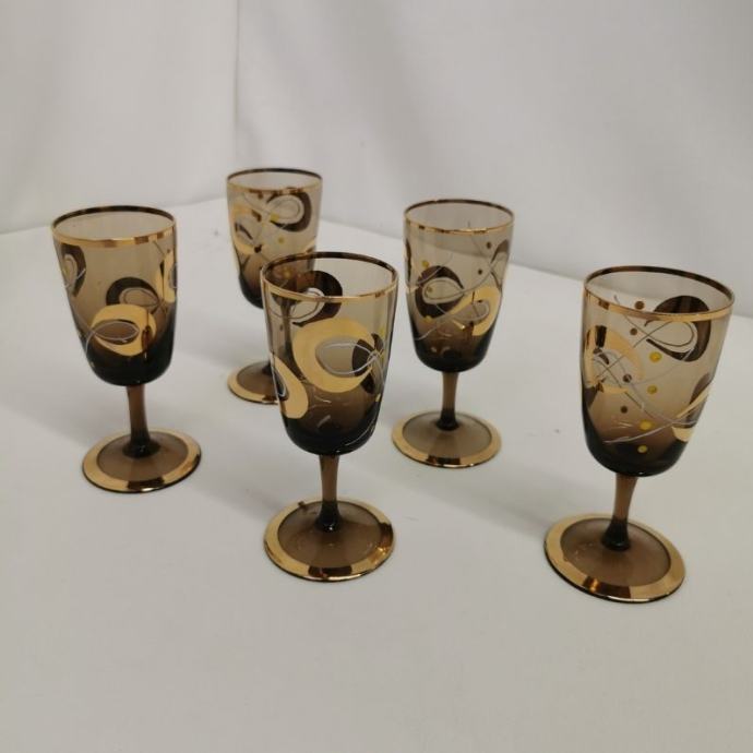 Set petih kozarcev z zatemnjenem steklom, pozlačenimi vzorci in robom, Češkega proizvajalca Bohemia.