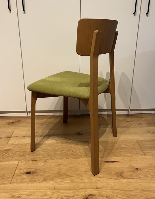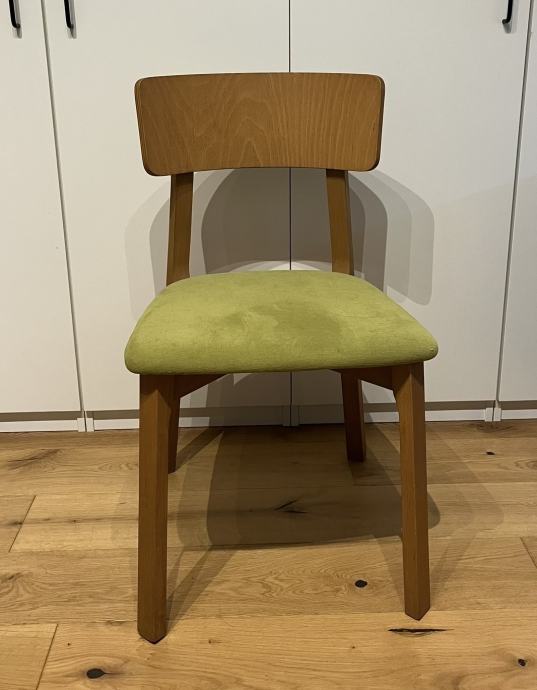 Tapecirano sedišče v zeleno blago, lesene nogice in naslonjalo