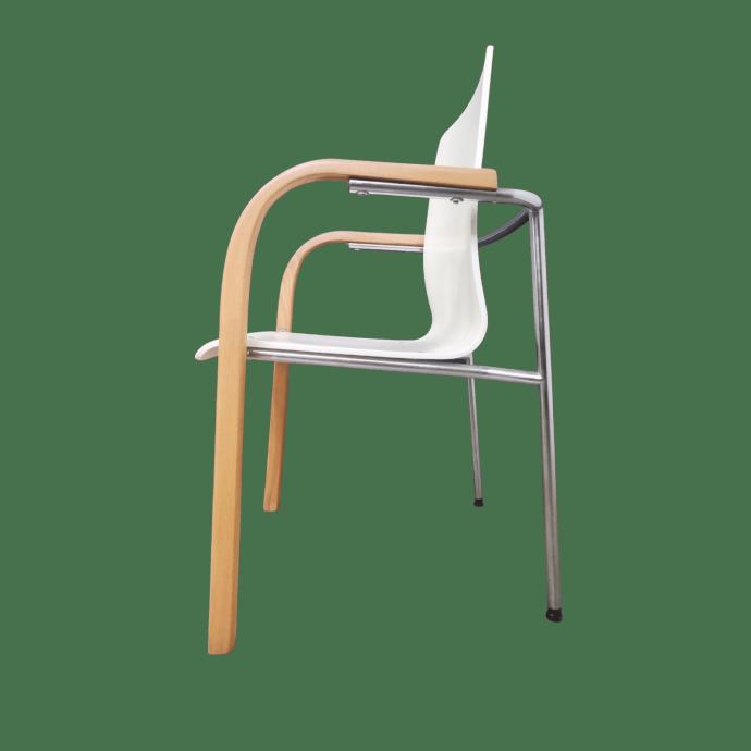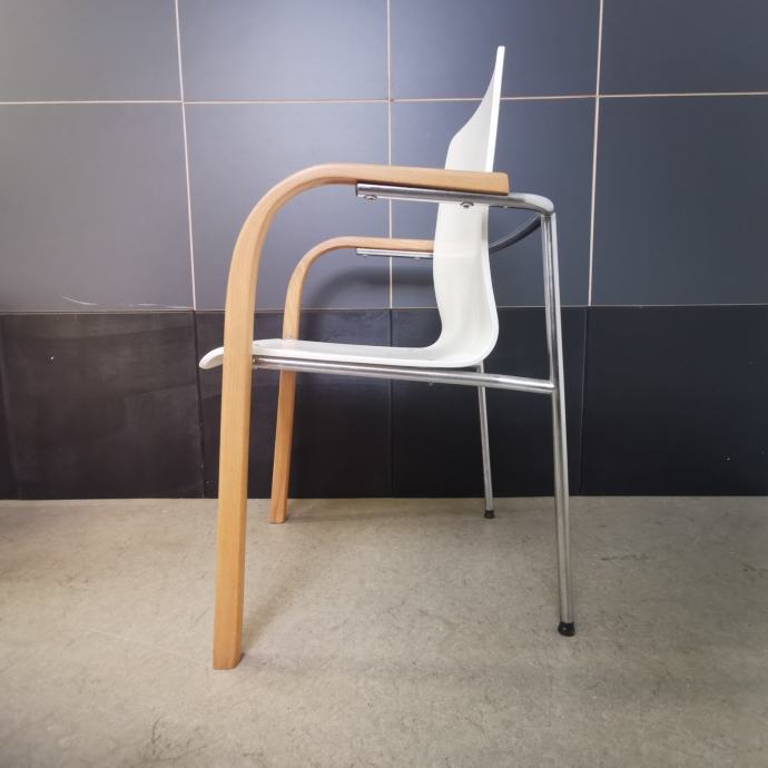 Mid-century moderen stol z belim lesenim sediščem, ukrivljenimi lesenimi ročaji in kromiranim kovinskim ogrodjem.