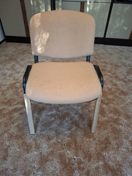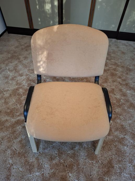 Stola nista bila nikoli v uporabi. Oblazinjeno sedalo in hrbtni del sta v bež barvi, ogrodje je črno.