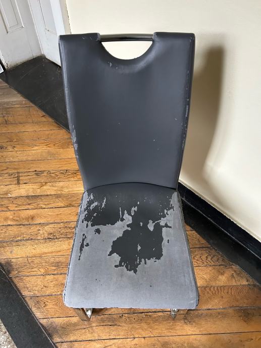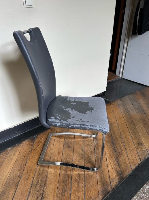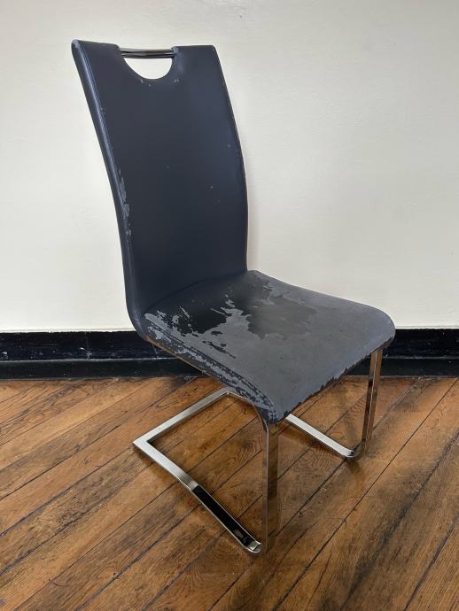 Stol z visokim naslonjalom in kovinskimi nogami. Prevleka obrabljena, potrebno bi ga bilo preobleči ali tapecirati. Stol se nagiba ko se nasloniš nanj. Cena po dogovoru. Prevzem Ljubljana Bežigrad