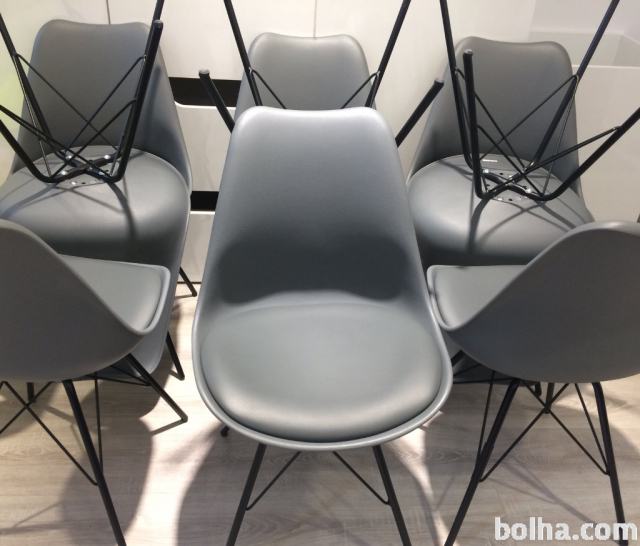 Čudovit moderni stol z železnim podnožjem, lakiranem v črni barvi, in s prevleko v videzu usnja sive barve, s katerim bo vaša jedilnica na novo zasijala, vi pa boste zahvaljujoč njegovemu mehkemu oblazinjenju iz pene ob obedih in druženjih sedeli nadvse udobno. Stol z merami približno 55,5/86/48 cm (Š/V/G), ki vas ne bo razočaral!